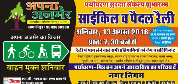 #1647 —————————————– अजमेर में वाहन मुक्त शनिवार के प्रति जागरुकता बढ़ाने के लिए 13 अगस्त को साइकिल रैली निकाली जाएगी। अपना अजमेर के सूत्रधार कंवल प्रकाश किशनानी ने बताया कि रैली प्रात: 7:30 बजे...
